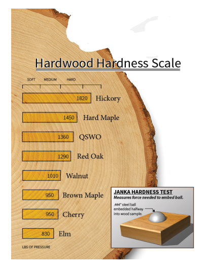 The Janka hardness test measures the resistance of a sample of wood to denting and wear. It measures the force required to embed an 11.28 millimeters (0.444 in) diameter steel ball halfway into a sample of wood. This method leaves a hemispherical indentation with an area of 200 mm². This is one of the best measures of the ability of wood species to withstand denting and wear. This chart displays all of the wood species The Amish Home Gallery provides.